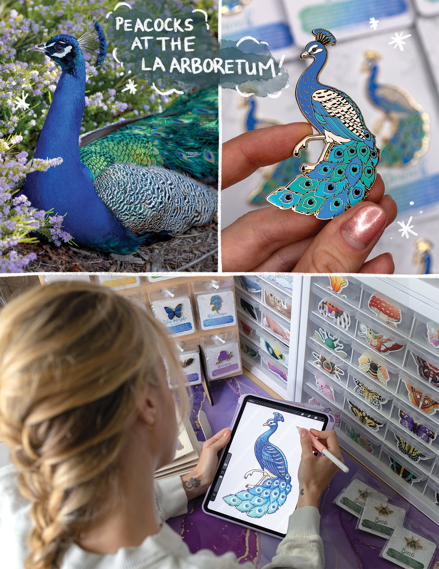 I’m always learning about new flowers, insects, and animals, and it’s so fun being able to share that with you through a little pin, keychain, or sticker. On a bigger level, my intention as an artist is to create pieces that remind you of all the beauty there is in this world.
